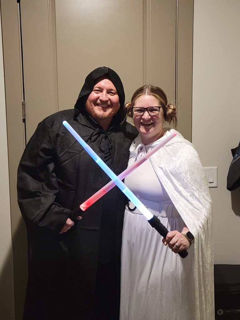 After celebrating and enjoying great food and drinks, we headed back to both mine and Alexโs places to start the Halloween shenanigans! I dressed as a witch and Alex wore a shirt that said, โPretend Iโm a broom!โ while Andy and Shawn got into their Star Wars outfits โ and had the coolest lightsabers!
