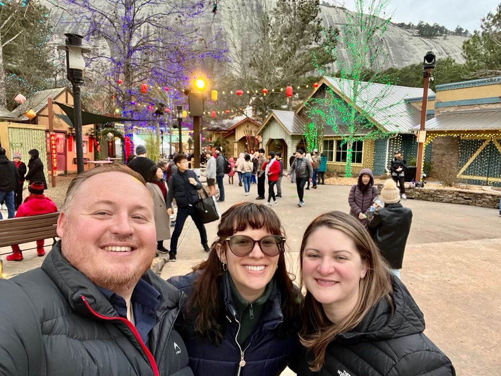 As soon as you walk in, you see these beautiful, silver birds that fly amongst the stars. Alex and I always venture to the main restaurant area for some holiday drinks before making our way through the greenhouse, larger garden where you can see the Atlanta skyline, and other tunnels of lights. This year we each got two: both were mezcal drinks, one being hot chocolate! We had to take an obligatory photo under one of my favorite tunnels.