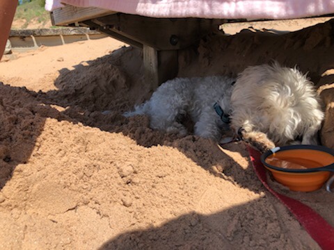 Linley had so much fun in the sand! We found a cool place where he had plenty of shade and could dig to make himself even cooler. We were on the beach for about an hour or so; we even put Linleyâs life jacket on so he could swim a little!