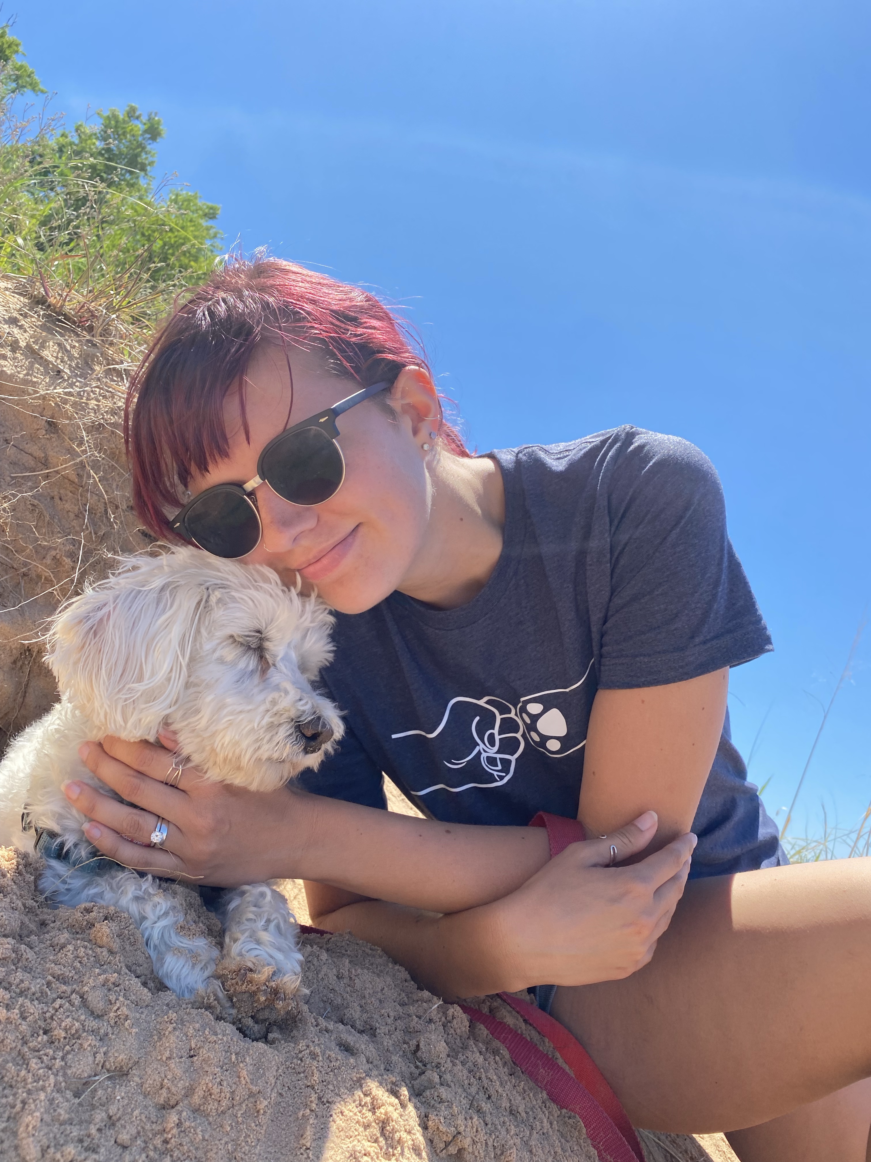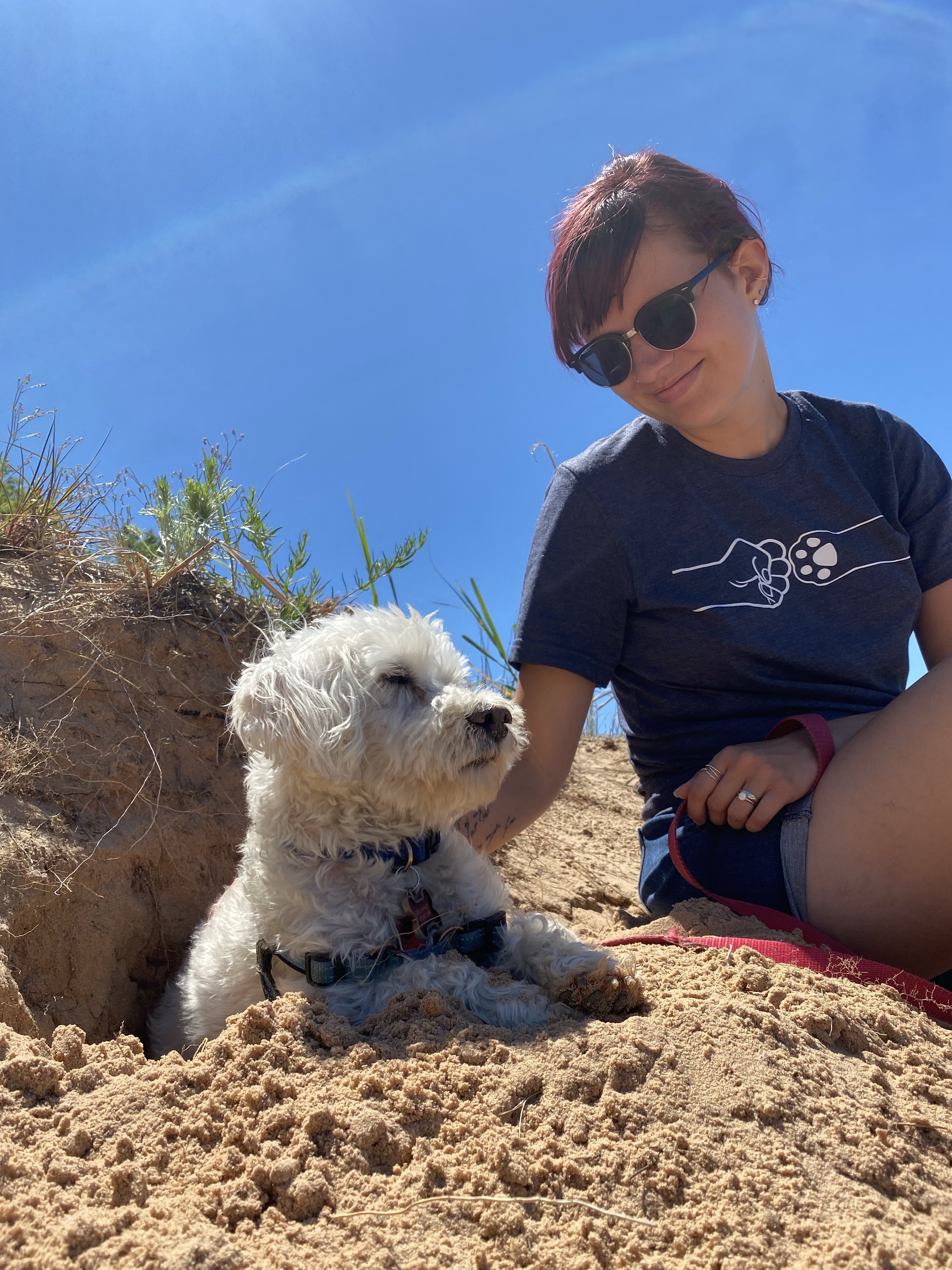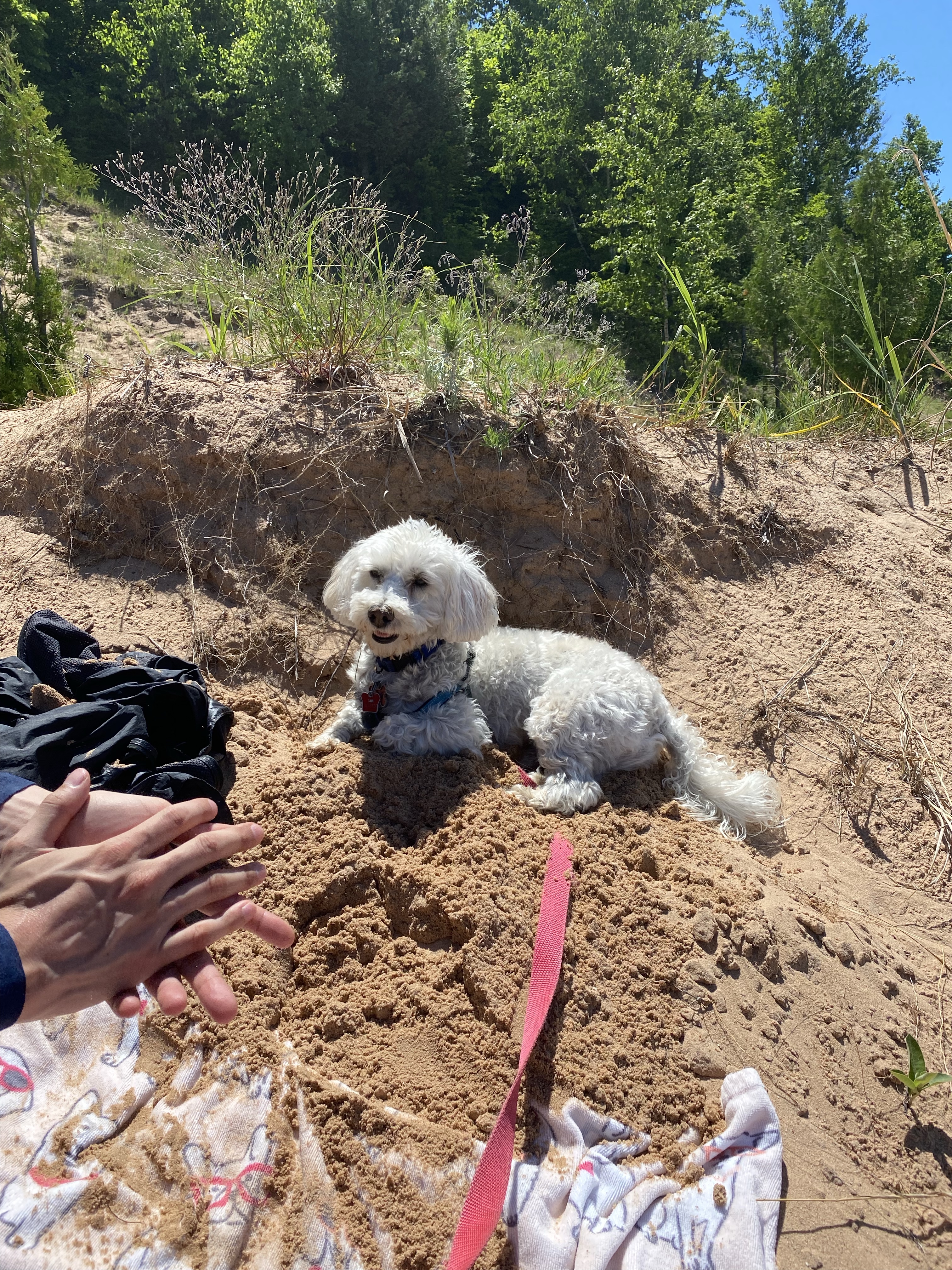 Linley was smiling, panting and pulling his way uphill on the trail. All the passersby were awestruck by his cuteness! Linley was kicking back in the dirt once he marked plants and trees, mostly on Juan and myself. He was refusing to act tired in the woods, but plopped down in the sand as soon as we got there. I smiled and laughed more at his shenanigans than I have in a long time! No words can express how much joy this 15-pound pup brings me ☺️