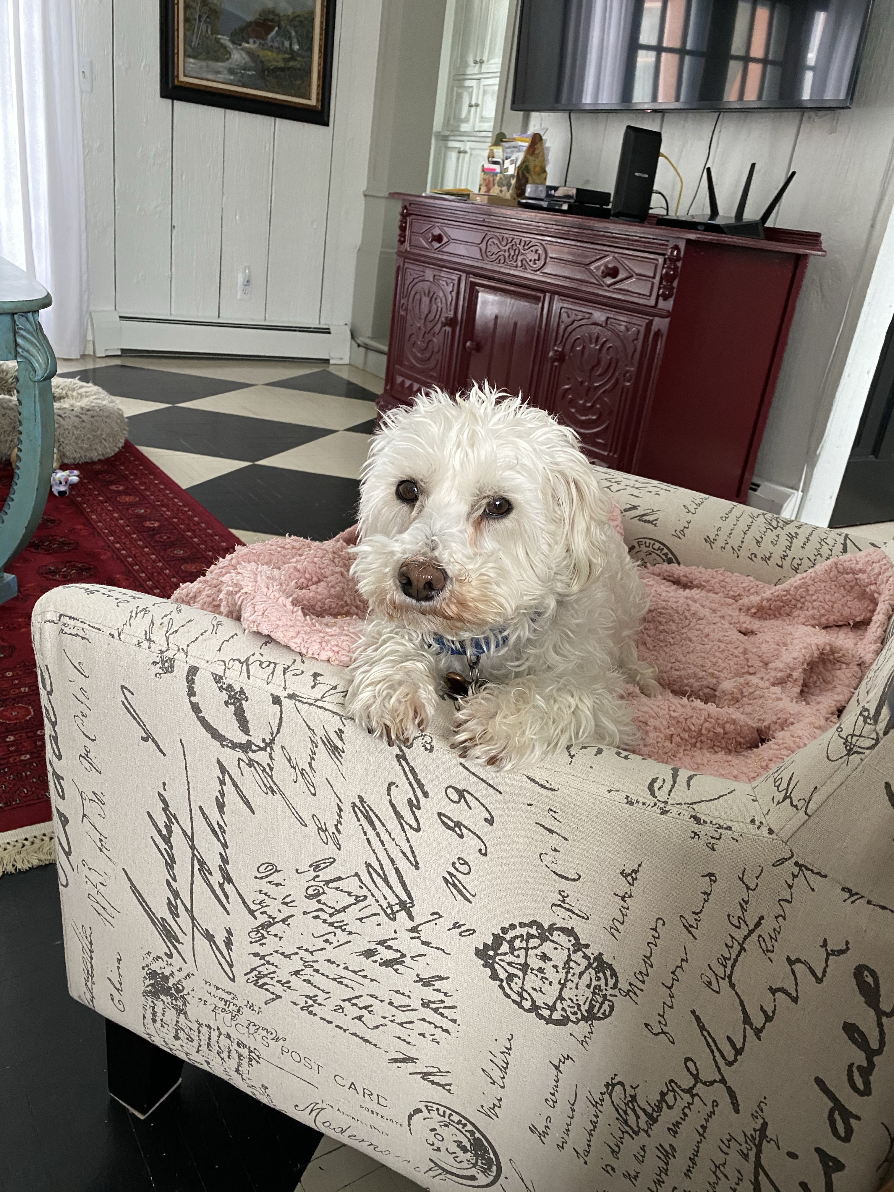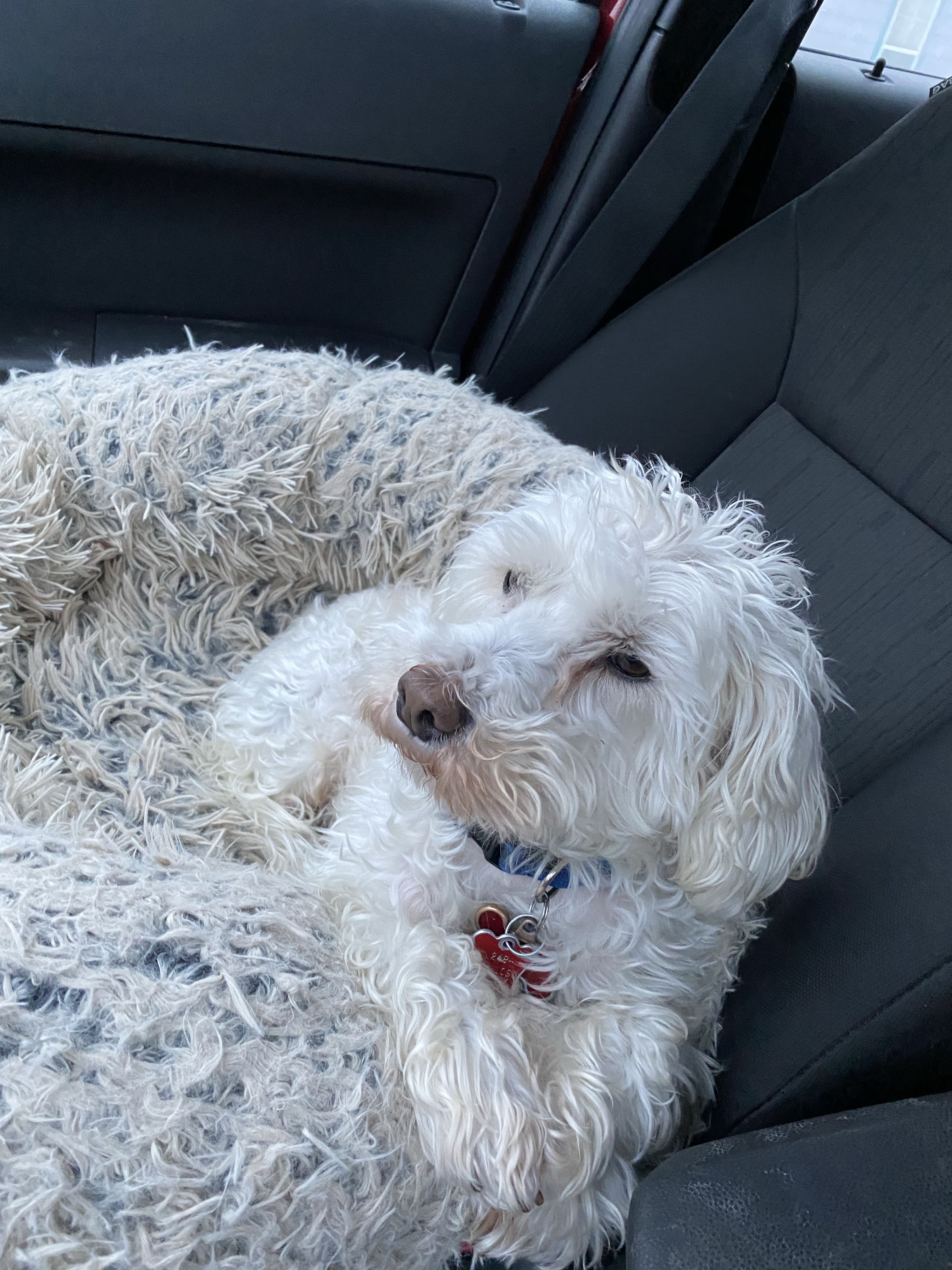 The pupper loves his car rides and cuddles in his pink blanket!