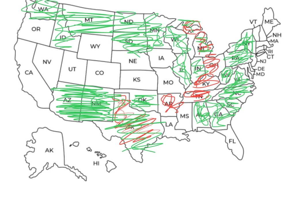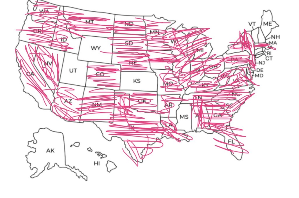 Of course, we’ve all traveled before we became the Tracey Trio, and I had to scratch off the states we’ve all been to!